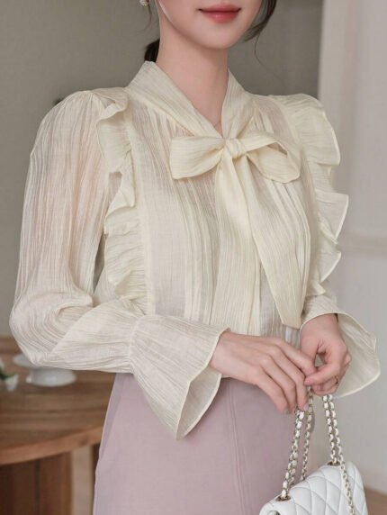 بلوزة نسائية بياقة ربطة وأكمام منتفخة