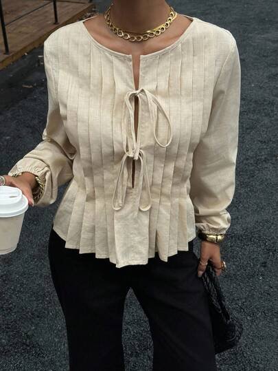 بلوزة نسائية بياقة مستديرة مع ربطة أمامية