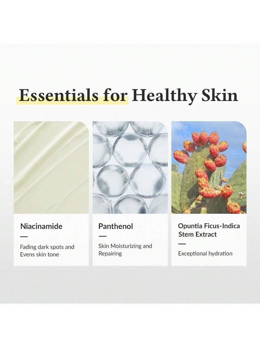 - تفتيح وتوحيد لون البشرة: تحتوي التركيبة على النياسيناميد الذي يساعد في تقليل البقع الداكنة وتفتيح لون البشرة بشكل طبيعي.
