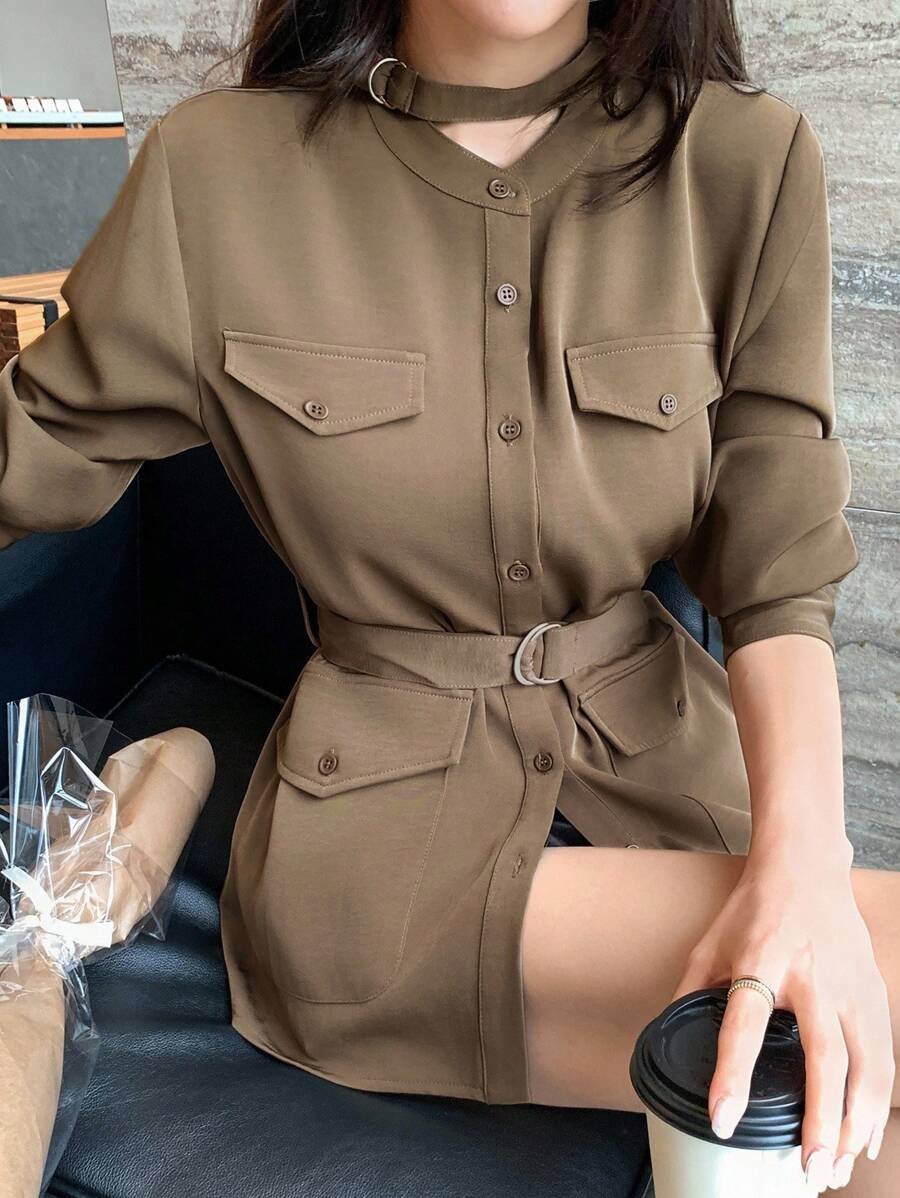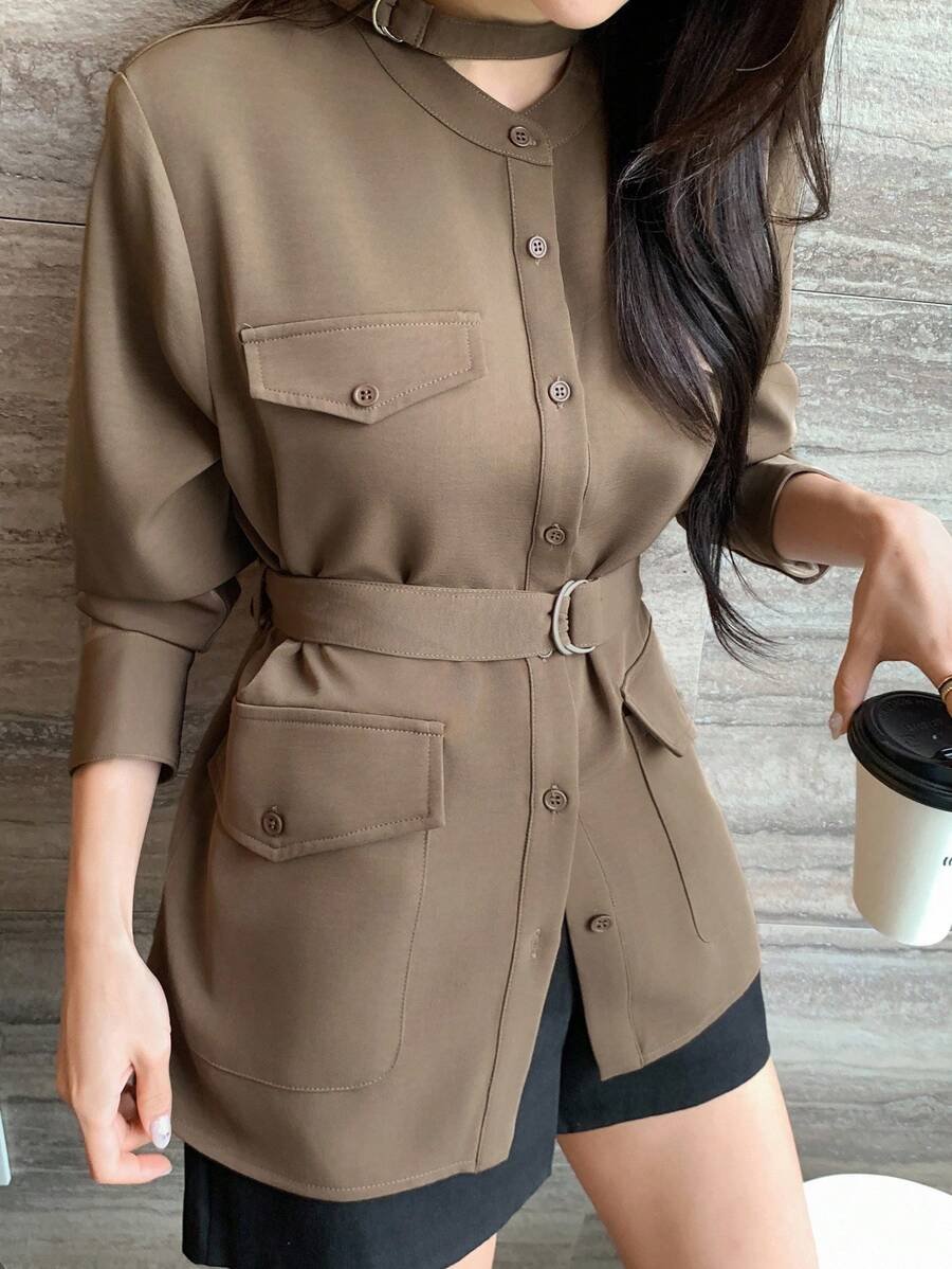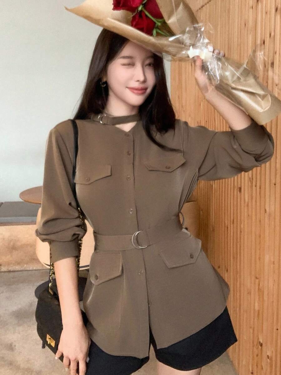 • اسم المنتج: قميص نسائي أنيق بأزرار غير متماثلة وربطة خضراء