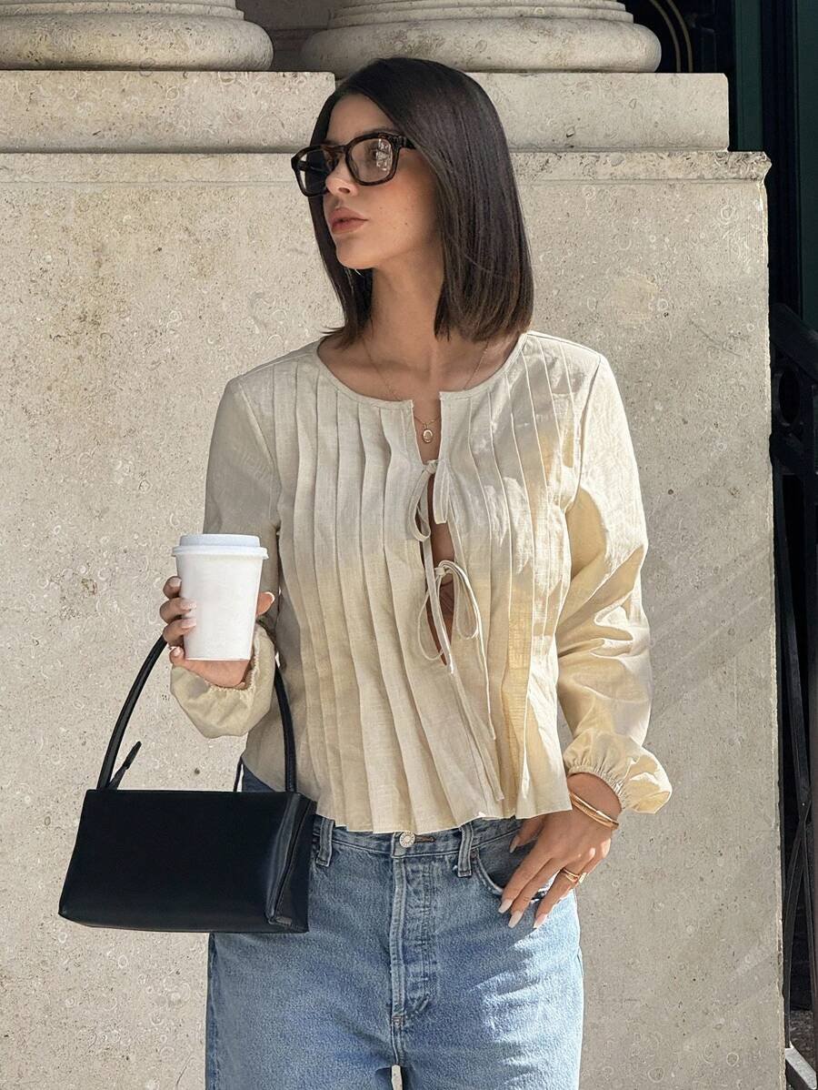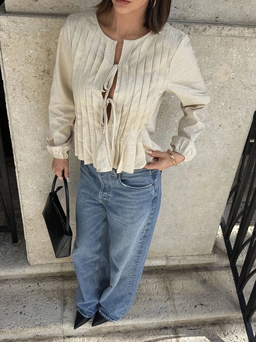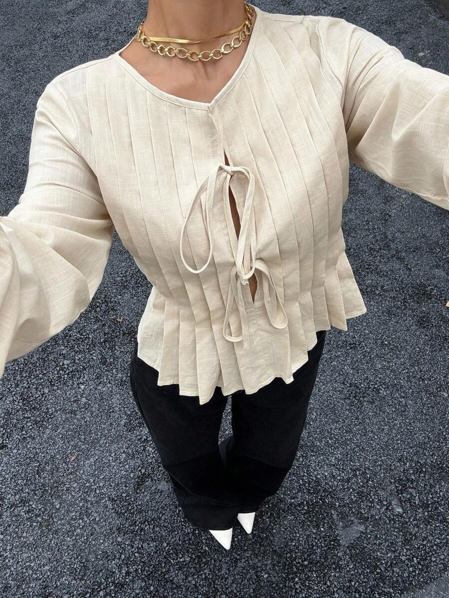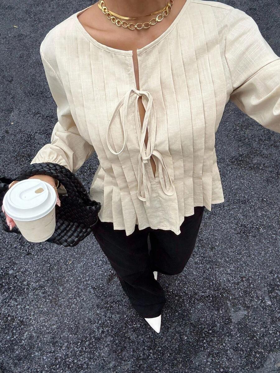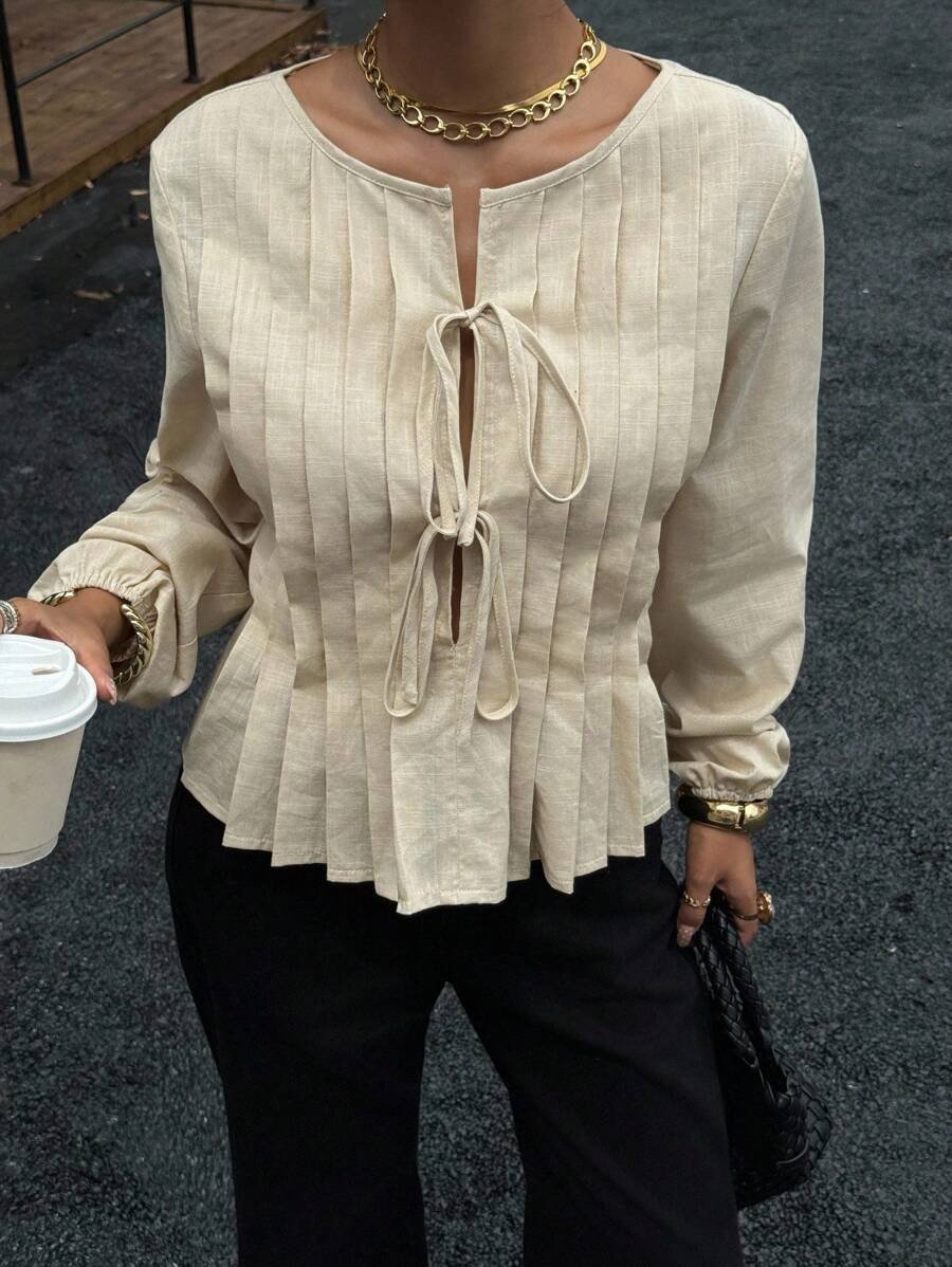 - اسم المنتج: بلوزة نسائية بياقة مستديرة مع ربطة أمامية